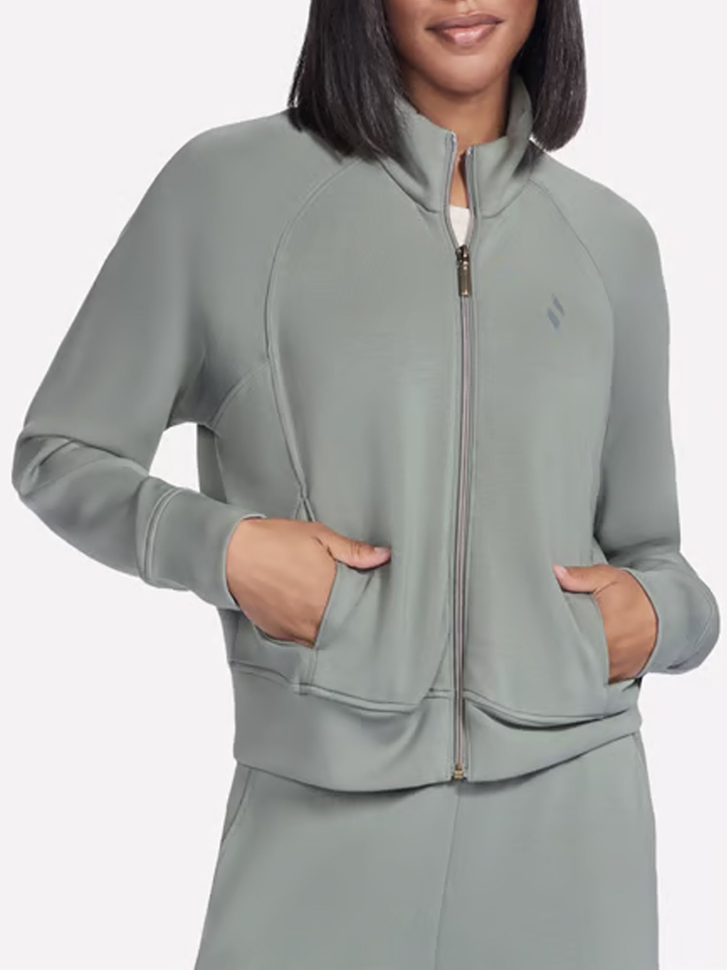 questa giacca con mezzo collo e cerniera integrale è realizzata in morbido e setoso tessuto skechluxe elevate e presenta un bordo elasticizzato su polsini e orlo inferiore, cuciture princess e tasche in cucitura anteriori