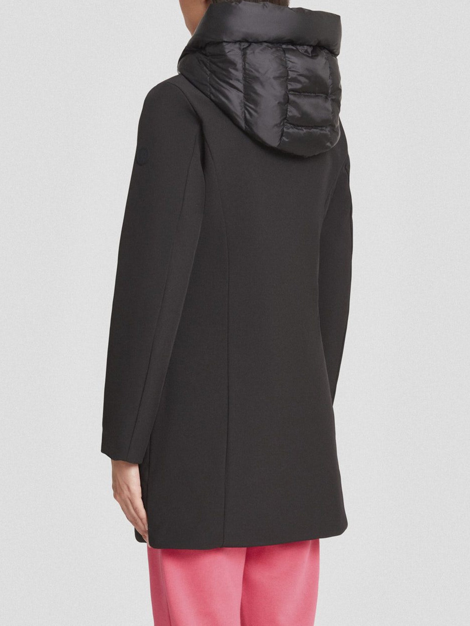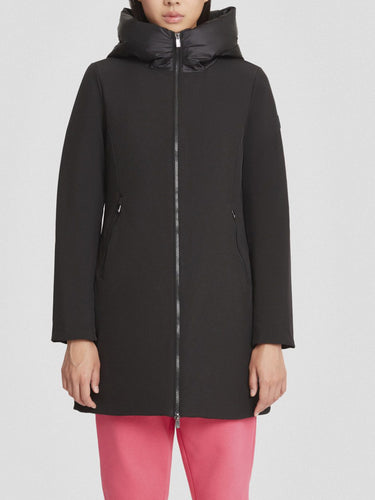 giacca lunga marrone da donna, realizzata in tessuto softshell 3 layers con laminazione dry-tech e imbottita in vera piuma 80/20.