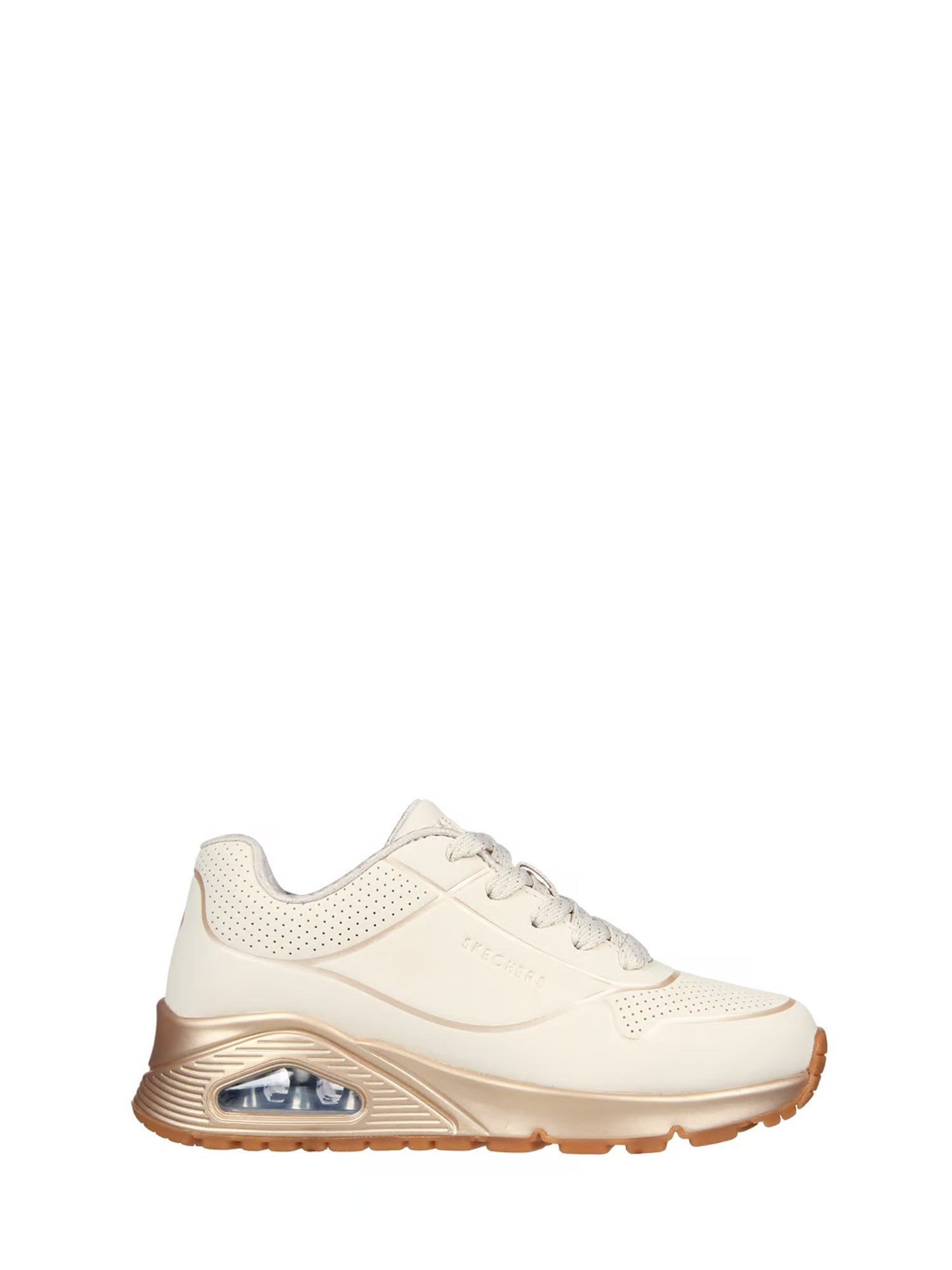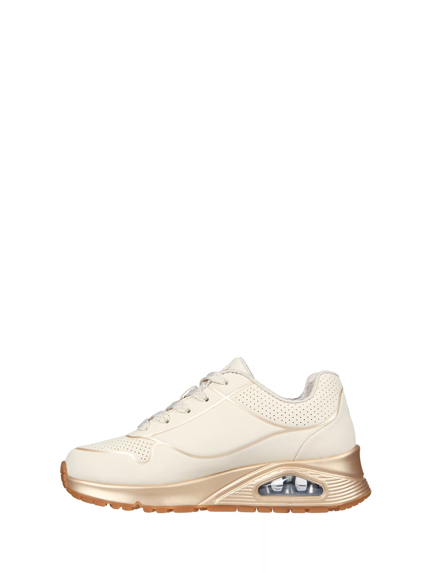 questa sneaker allacciata di tendenza presenta una tomaia in durabuck tecnico traforata con finiture metallizzate, una comoda soletta skechers air cooled memory foam® e un�?Tintersuola ammortizzata ad aria con tecnologia visibile skech-air®.