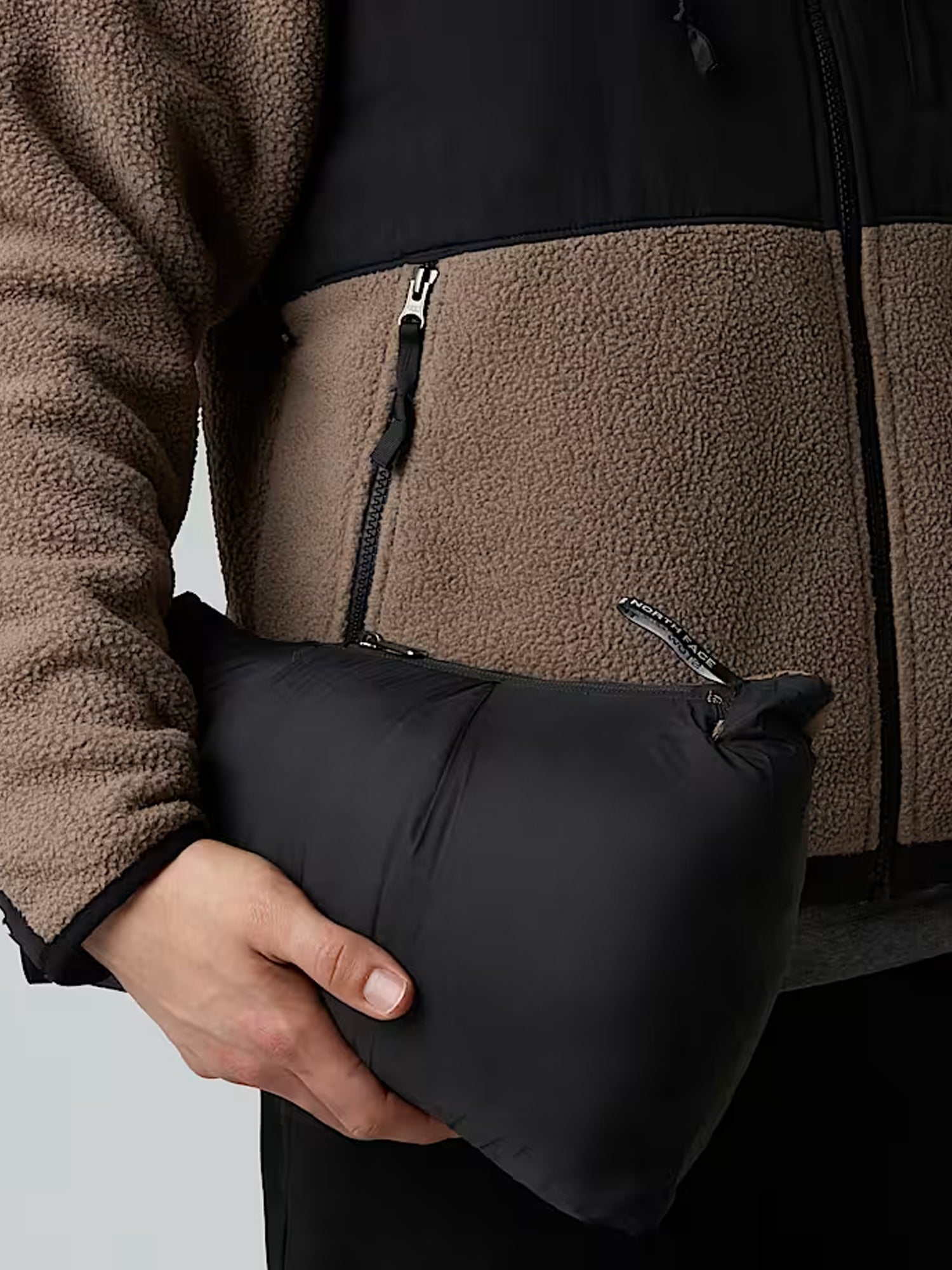 la giacca si ripiega nella sua tasca destra.