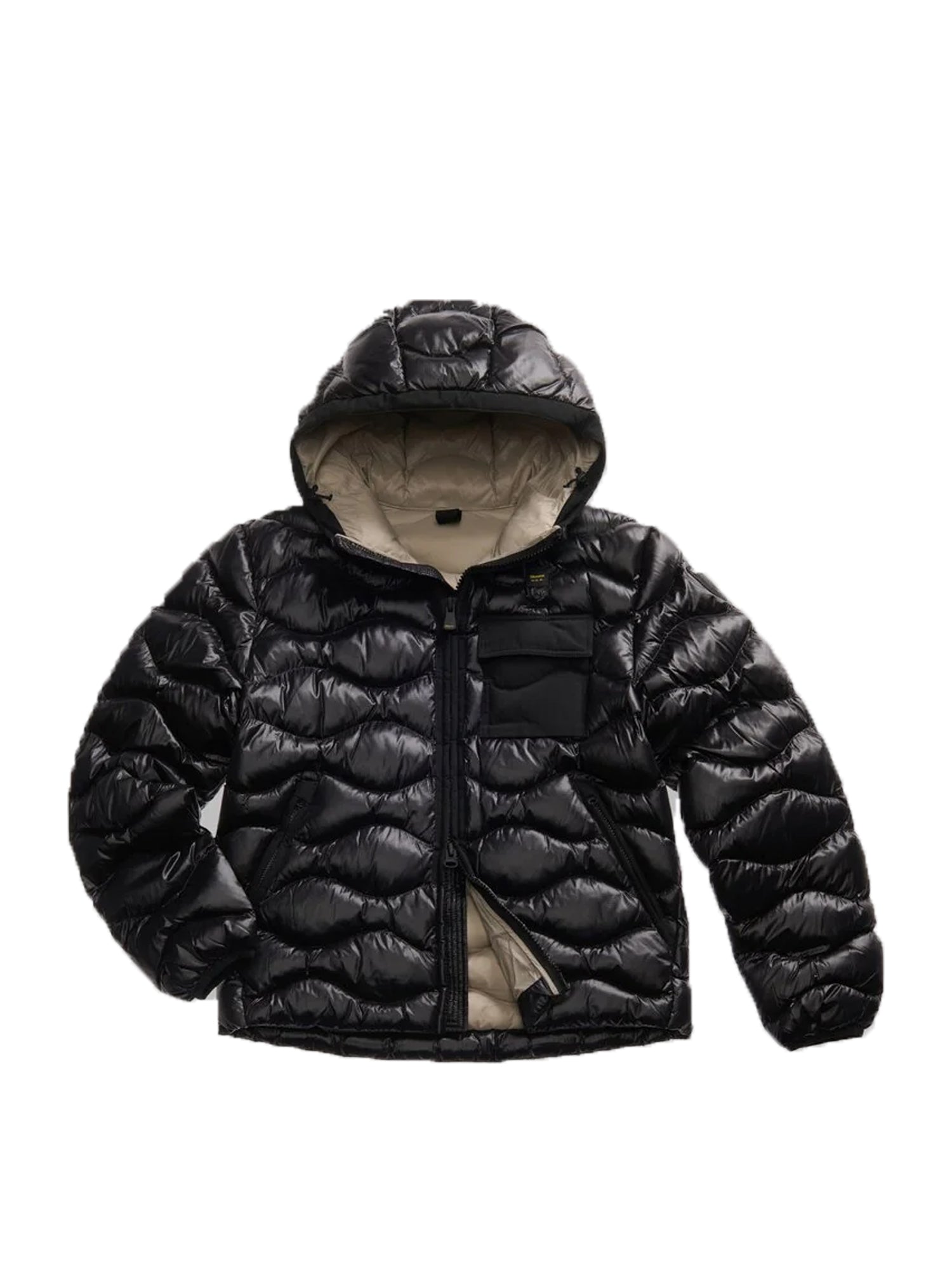 inserti in taslan in tono su cappuccio e bordo zip e sulla tasca applicata sul petto.
