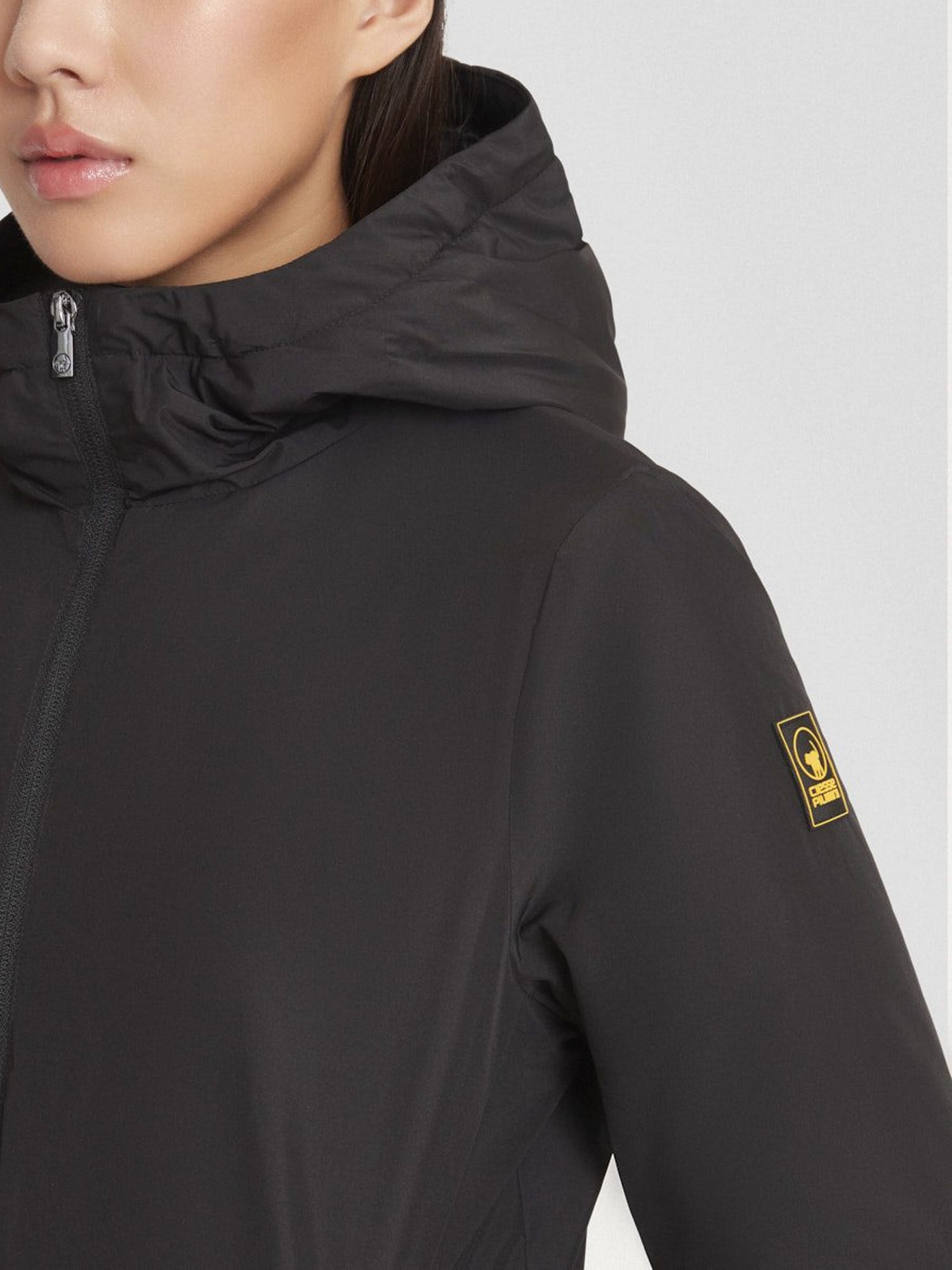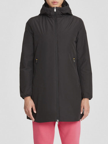 giacca imbottita lunga nera con cappuccio, realizzata in tessuto poly taslan: resistente, leggero e trattato dwr per una protezione efficace dagli agenti esterni. l�?Timbottitura in ovatta da 80 grammi assicura calore e comfort.