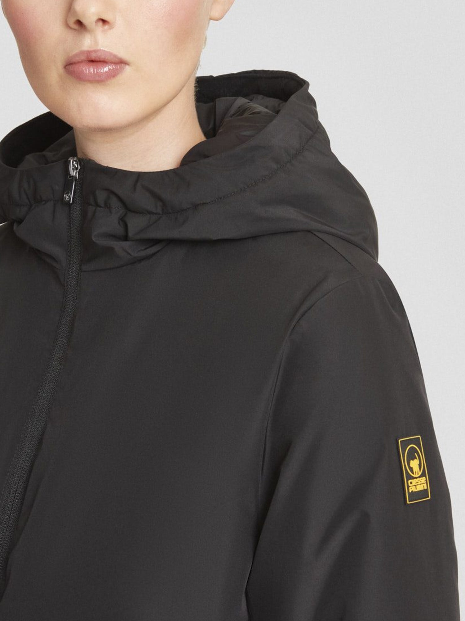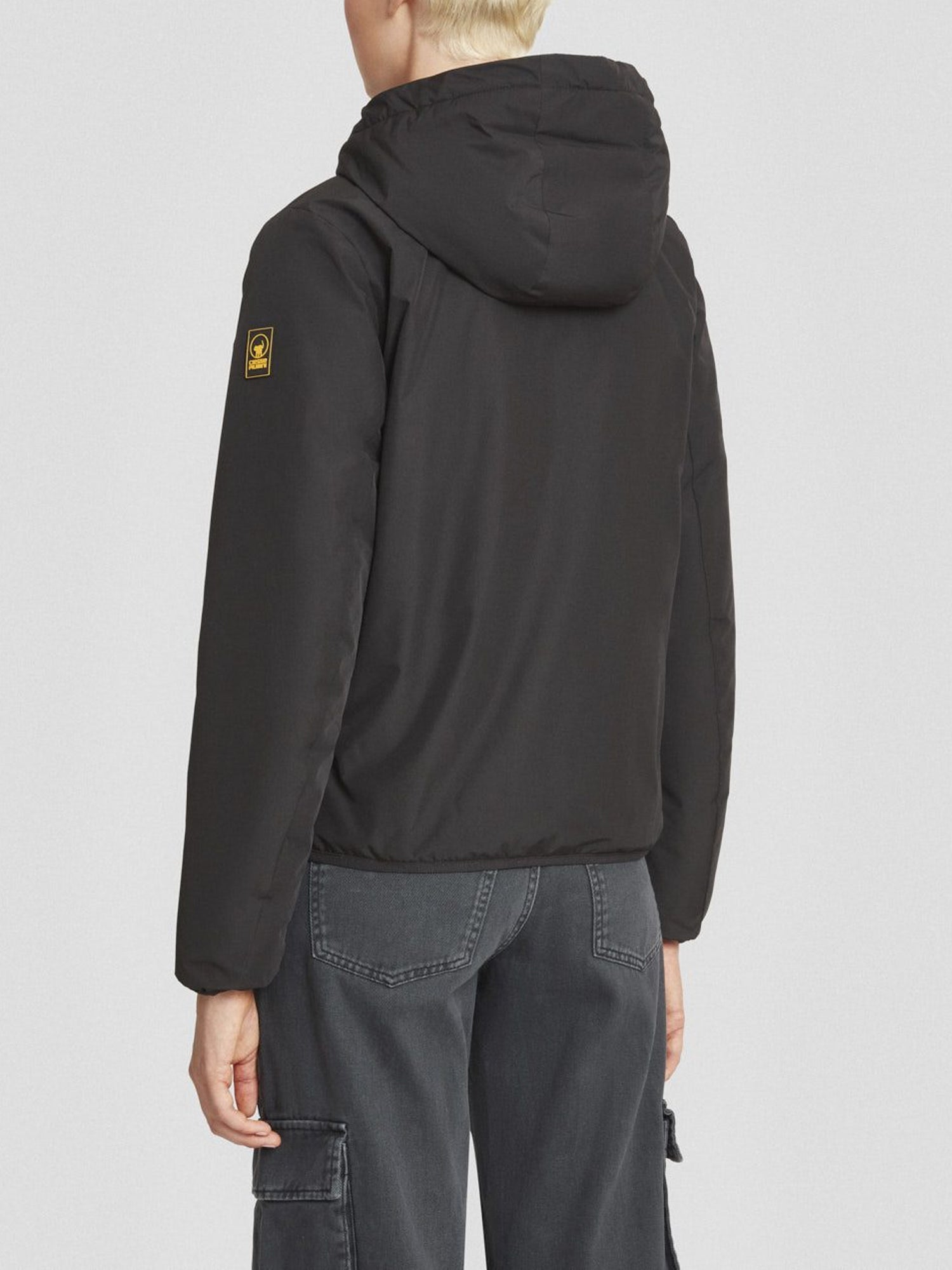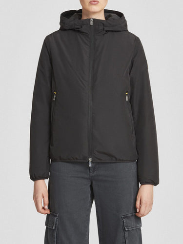 giacca imbottita nera con cappuccio realizzata in tessuto poly taslan: resistente, leggero e trattato dwr per una protezione efficace dagli agenti esterni.