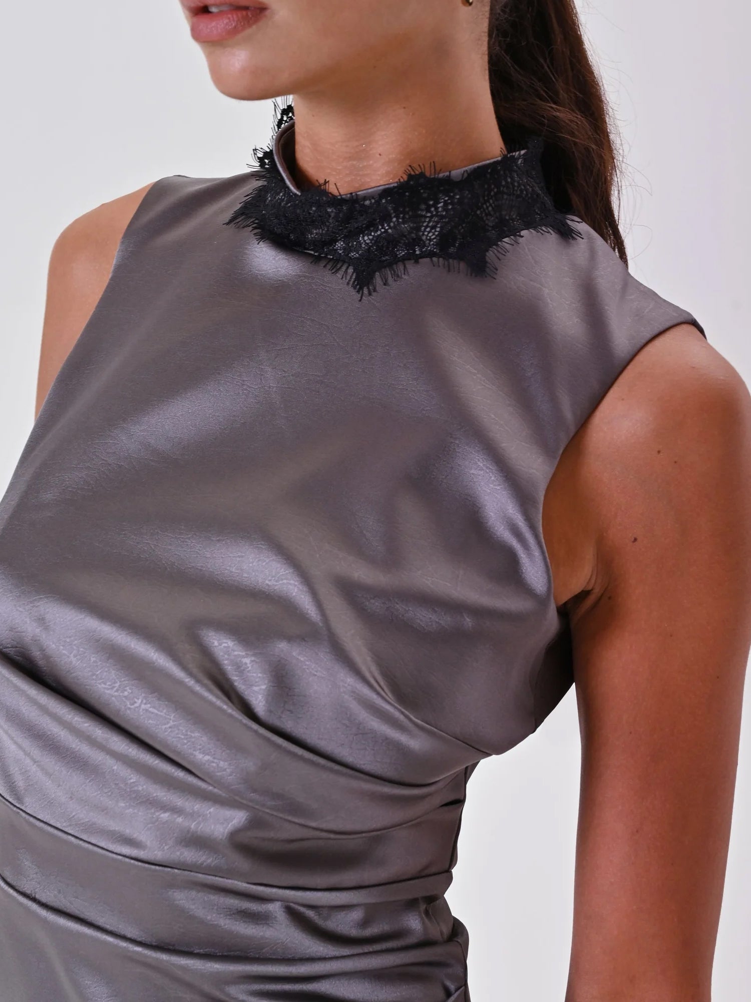 realizzato in raso operato con disegno a venature, offre una texture luminosa e sofisticata. il collo in piedi arricchito da un delicato decoro in pizzo aggiunge un tocco romantico, mentre il drappeggio laterale esalta le forme con femminilità. la chiusura con zip e bottoncino garantisce una vestibilità confortevole e sicura.